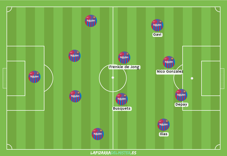 -Organización con pelota en 3-1-4-2 con Gavi cerca de Depay y Sergio Busquets por delante de la línea de tres.
