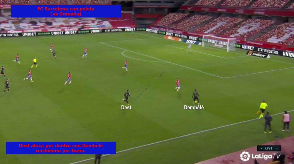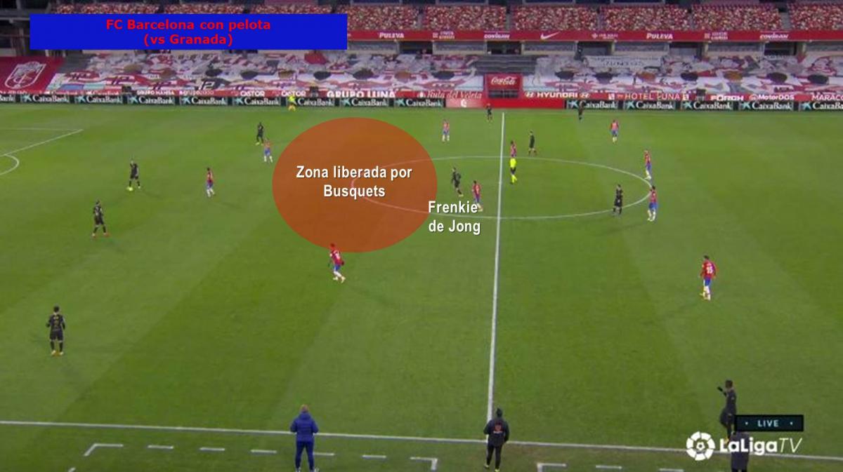 -El rol de De Jong: El neerlandés es uno de los jugadores más beneficiados con esta postura y, como no podía ser de otra forma, lo está regresando todo con creces. Frenkie tiene mucho más libertad como interior para poder participar en la base de la jugada como para ganar metros con su conducción para llegar al pico del área. Una versión más cercana a lo que mostró en el Ajax. Está viendo el juego siempre de cara y eso es fundamental para que su rendimiento sea alto y el Barcelona pueda rendir.