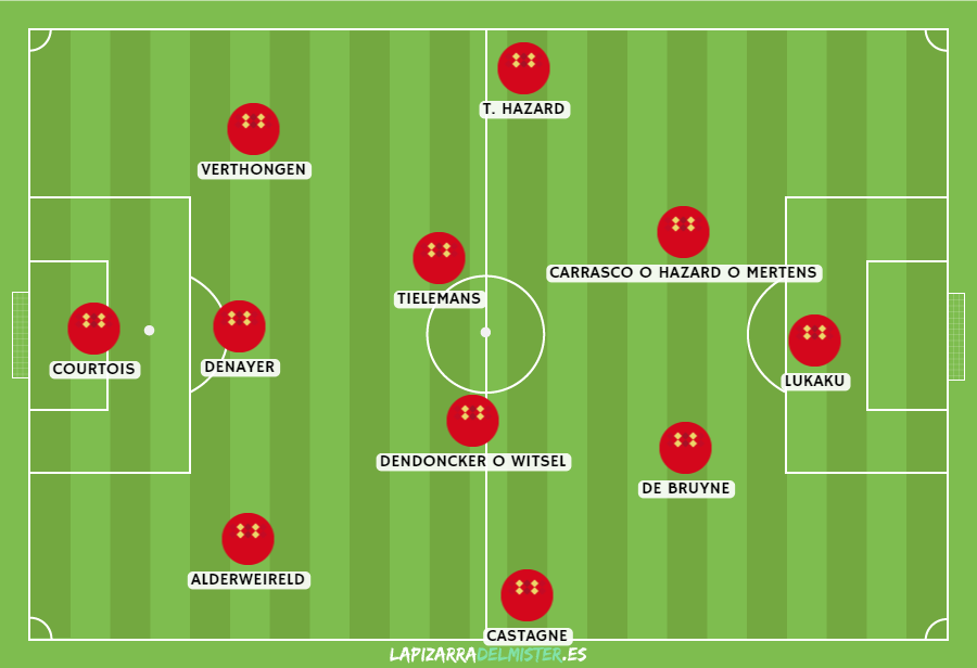 - El 1-3-4-2-1: El sistema que ha utilizado Roberto Martínez para construir un contexto positivo para sus principales piezas. La principal duda del once titular aparece en los carriles, teniendo en cuenta que el entrenador español ha utilizado a Thomas Meunier, Timothy Castagne, Yannick Ferreira Carrasco, Chadli y Thorgan Hazard, por lo que tenemos que esperar a ver quiénes serán las titulares.
