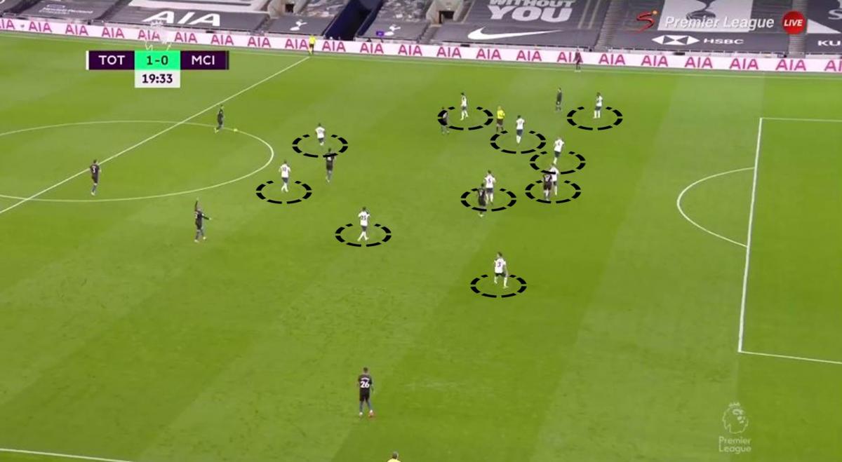 Los extremos (Heung-Min Son y Steve Bergwjein) descendían de manera constante para generar superioridad en banda con sus laterales y Harr Kane + Tanguy Ndombélé cerraban las líneas de progresión por dentro con los mediocampistas, tanto el mediocentro como con sus interiores.