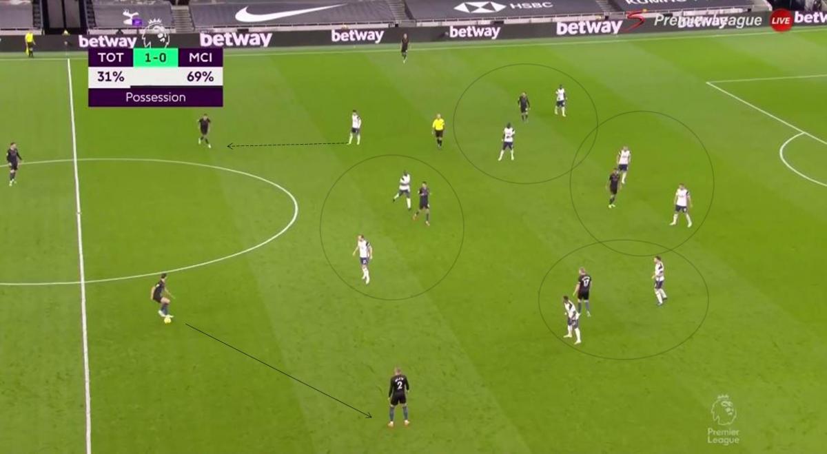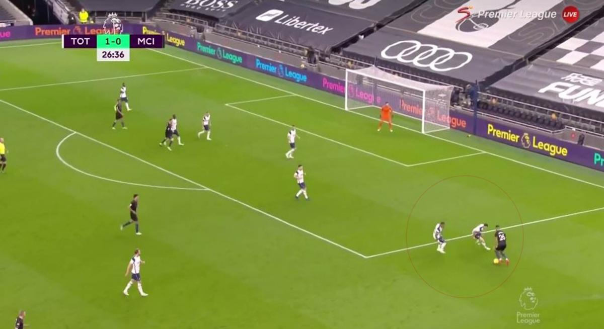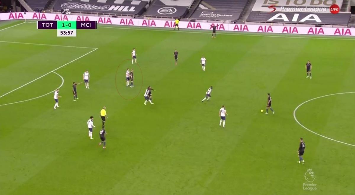 El danés fue clave para generar ventajas en el carril derecho (zona predilecta del ataque del Manchester City) y vigilar a Kevin de Bruyne cuando este se movía por su zona. Hojbjerg siempre ajustaba su posición dependiendo de los movimientos del belga y consiguió neutralizar sus intervenciones en las zonas donde más peligro genera, tanto a nivel individual como por sistema.