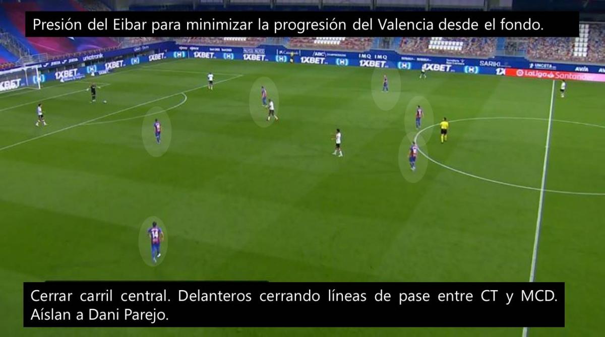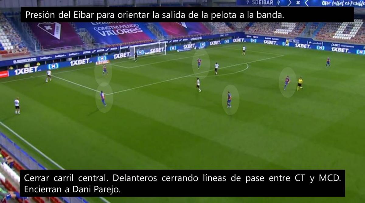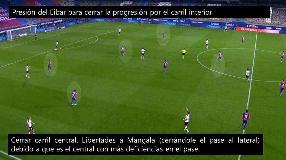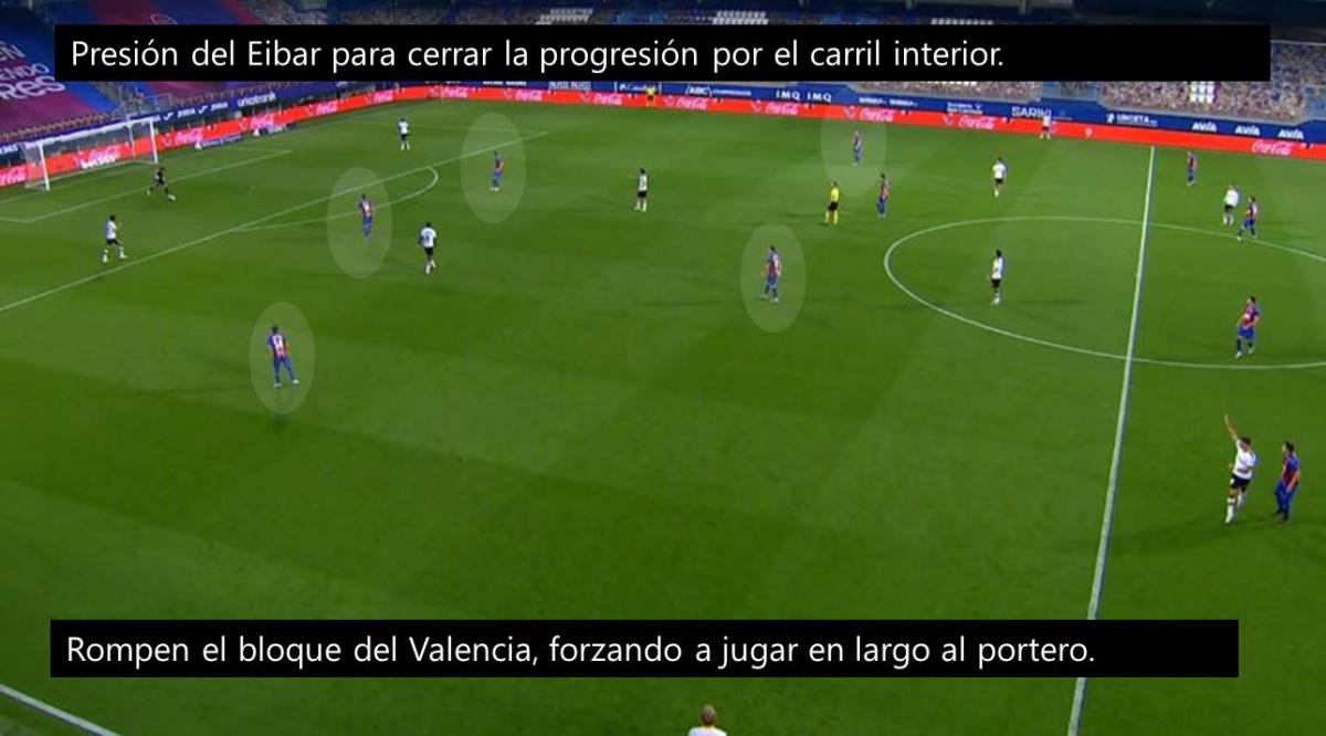 Una de las claves del triunfo Los Armeros fue la presión que ejercieron en bloque en campo rival, neutralizando y desnaturalizando la salida de la pelota del Valencia que, sin la posibilidad de progresar, se vio enredado en un dinámica negativa que terminó con la imposibilidad de competir ante un rival inferior a nivel individual. Por esa razón, analizaremos las dos presiones que ejerció el Eibar de Mendilibar en el partido contra el Valencia que, al mismo tiempo, prácticamente sentenció la continuidad de Celades en el banquillo.