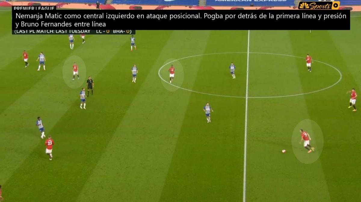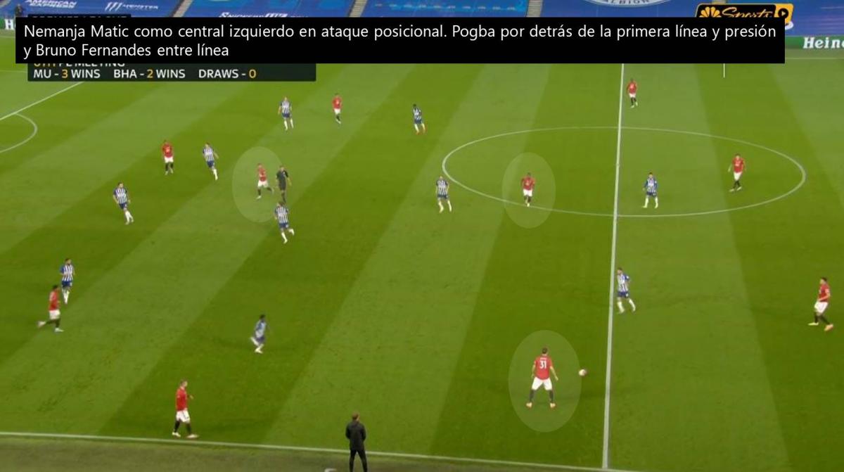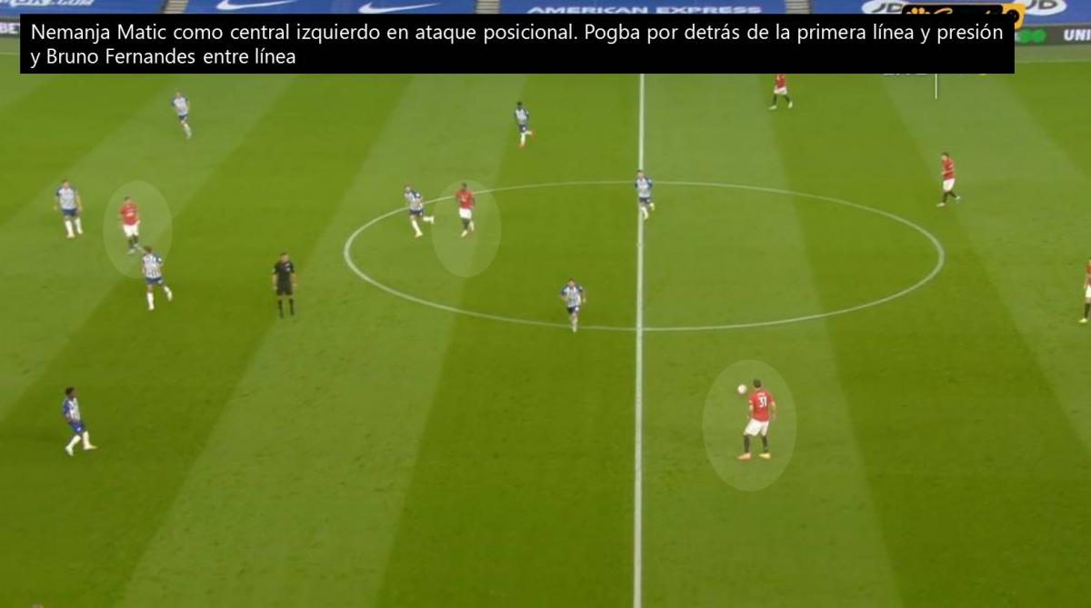 Pero, para adentrarnos en el análisis, es necesario incluir a Nemanja Matic en la ecuación. El volante central serbio, fungiendo como mediocentro defensivo, es fundamental debido a que es el dueño del primer pase, sea por delante de los centrales o lateralizando para conformar una salida de tres, y porque le aporta solidez al sistema de juego. Su función para darle solidez al bloque tras la pérdida es fundamental para soltar a Paul Pogba y liberar a Bruno Fernandes.