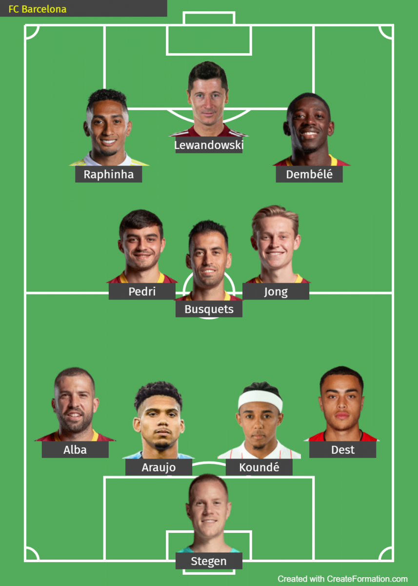 Actualmente, con Ter Stegen en portería, Serginho Dest en el lateral derecho, con los centrales ocupados por Ronald Araújo y, cuestión de tiempo, por Jules Koundé, con Jordi Alba a la banda izquierda, barajándose un refuerzo más en este costado. Un centro del campo con Busquets, con Pjanic o Nico como reemplazo, con Frenkie de Jong y Pedri, además de la posibilidad de Gavi. Mientras, en la delantera, el astro polaco, Lewandowski, con Dembélé y Raphinha a los costados, con la posibilidad de alinear a Ansu Fati.