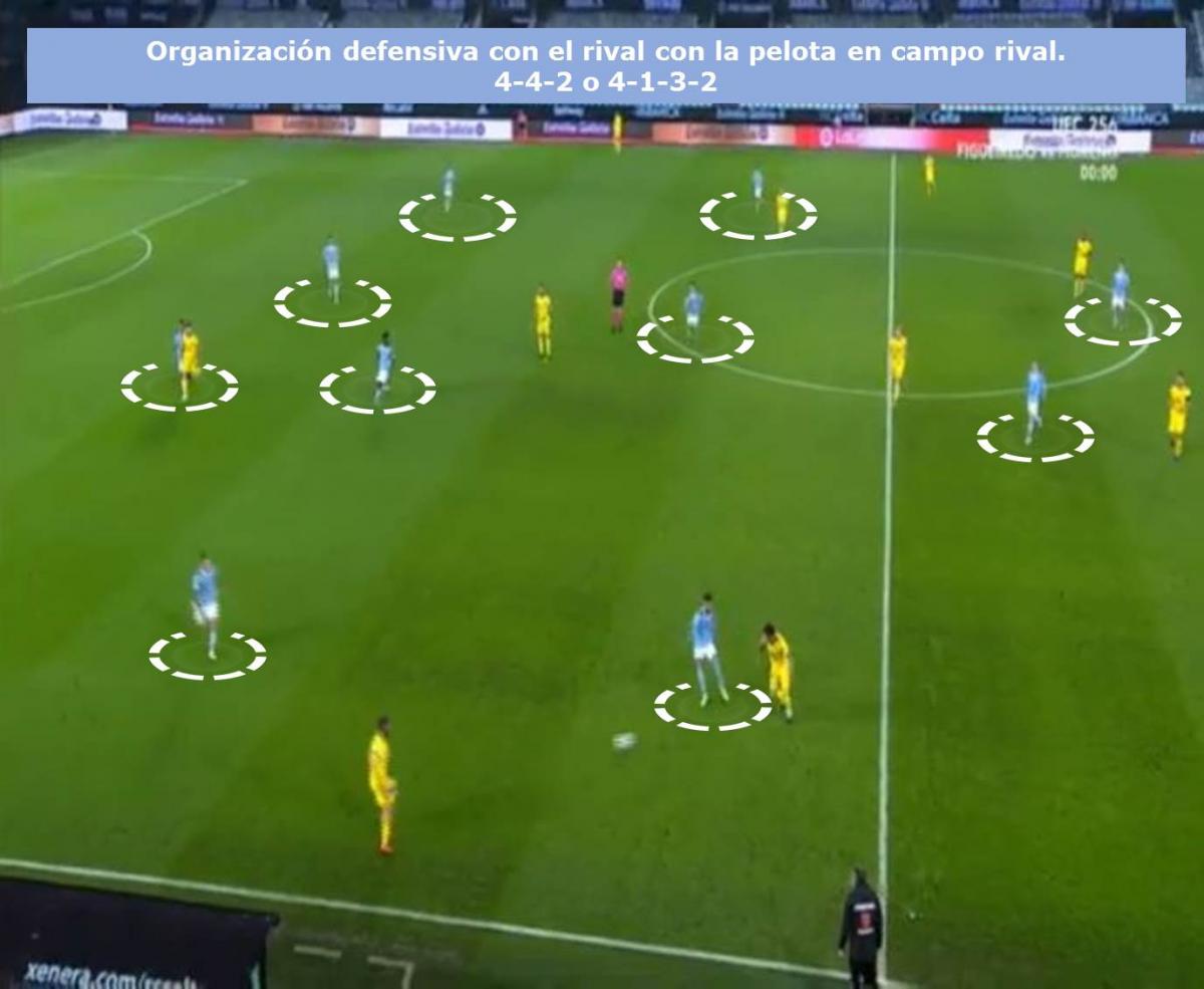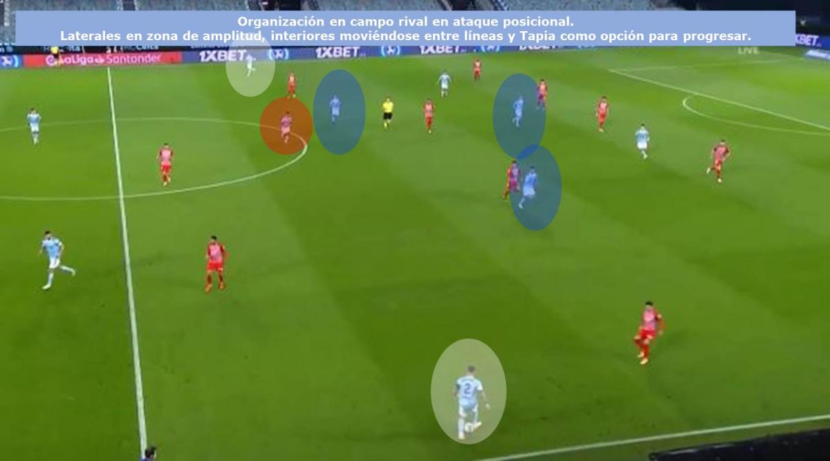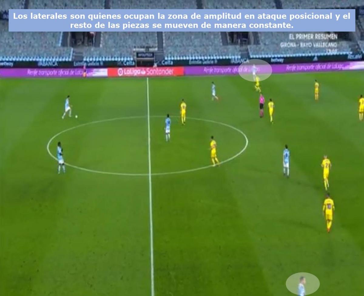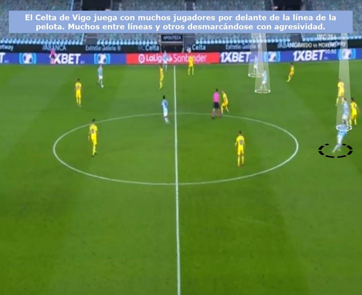 Pero, pese a lo antes mencionado, el Celta es un conjunto que no se mueve de manera desordenada, es decir, cada movimiento tiene un sentido propio de ocupar espacios abandonados por un compañero (realizando un movimiento de atracción a un defensa). También busca generar superioridad en las bandas con la presencia del lateral, interior y extremo.
