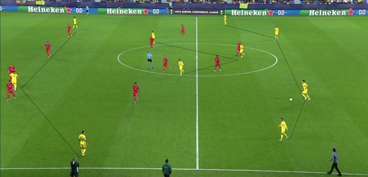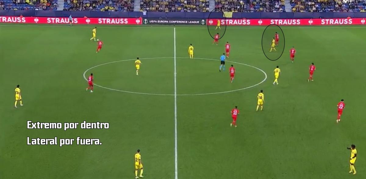 Álex Baena y Manu Trigueros como interiores: Buen partido de ambos alternando alturas, ofreciendo líneas de pase a los centrales (y al mediocentro), apoyando en la base de la jugada para tener superioridad en la zona y verticalizando las jugadas recibiendo en escalones superiores.